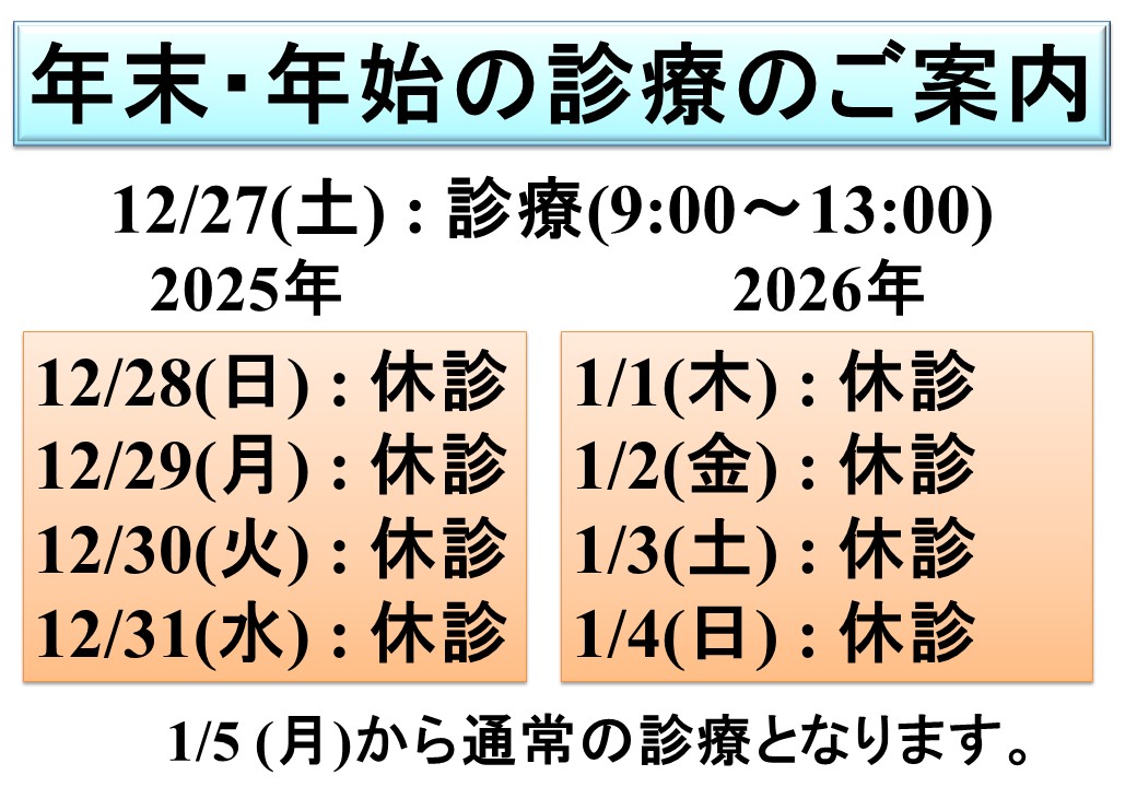 年末年始の診療のご案内(12/28~1/4休診. 1/5から通常診療.)