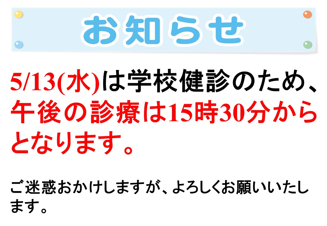 5/13(水)は学校健診のため, 午後の診療は15:30からです.