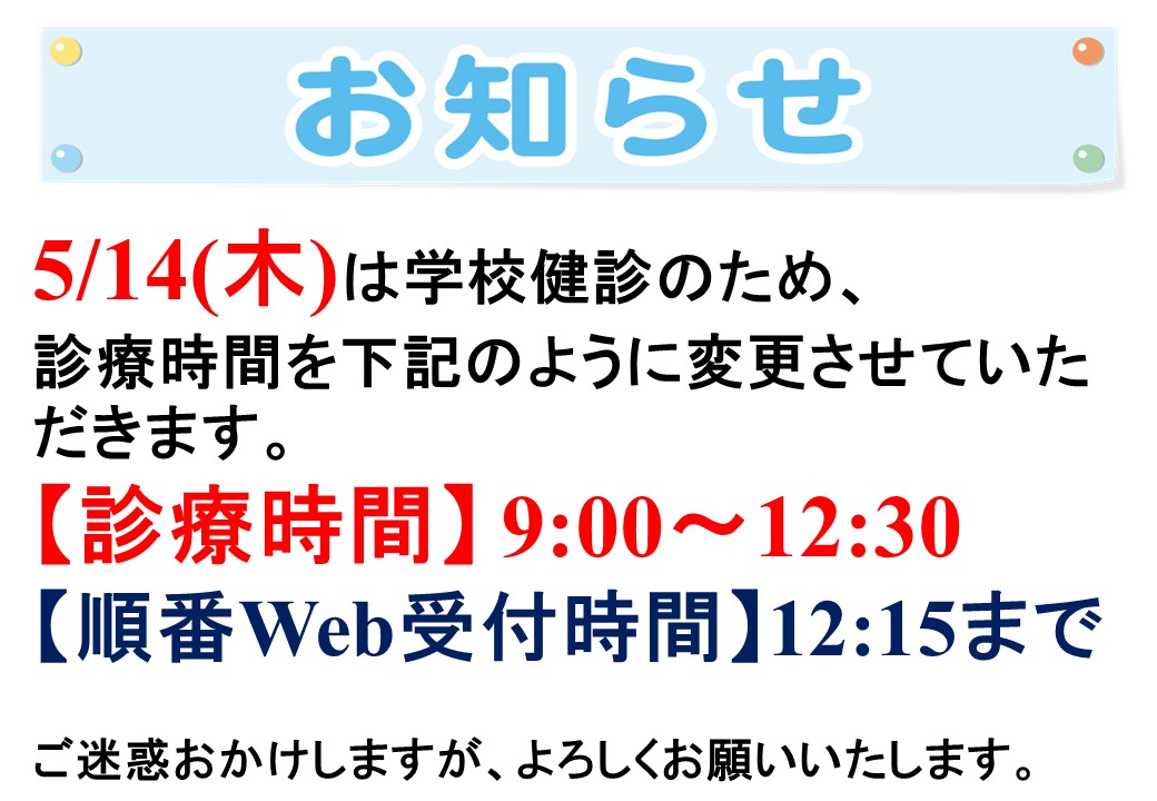 5/14(木)は学校健診のため, 診療時間は12:30までです.