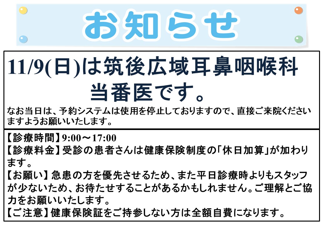 11/9(日)は筑後広域耳鼻咽喉科日・祝日当番医です(9時~17時).